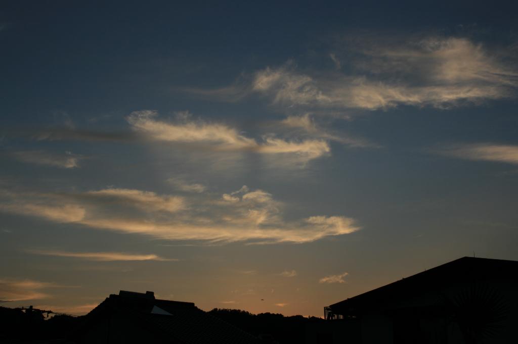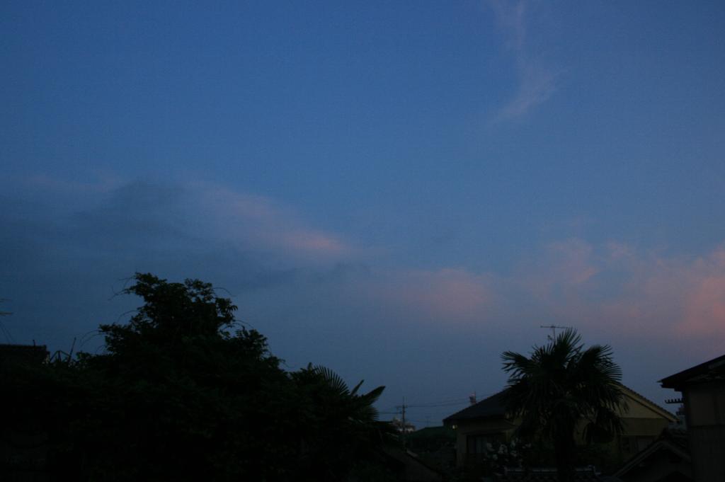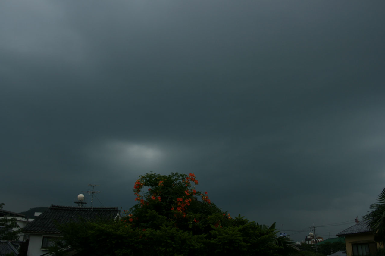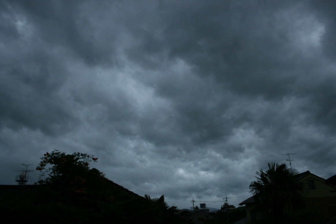 九州まで来ている台風。その渦巻きの端っこのちぎれ雲が、大急ぎで西空に向かっている。午後6時50分。