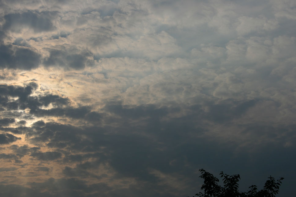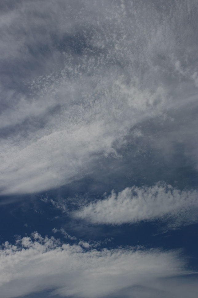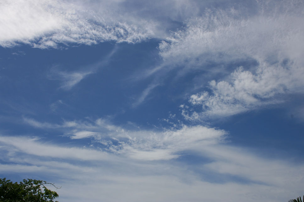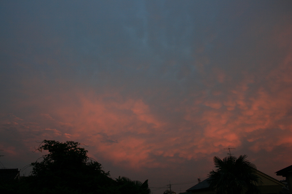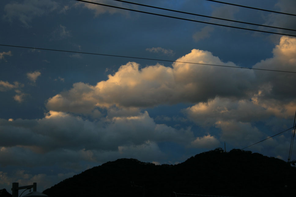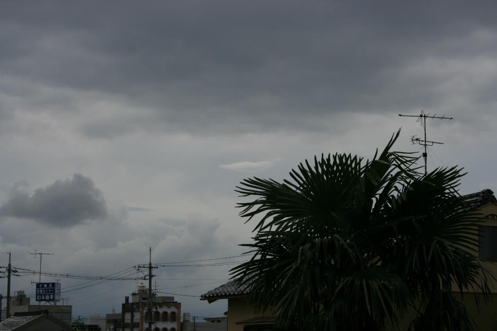 九州まで来ている台風。その渦巻きの端っこのちぎれ雲が、大急ぎで西空に向かっている。午後6時50分。