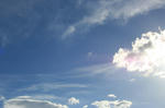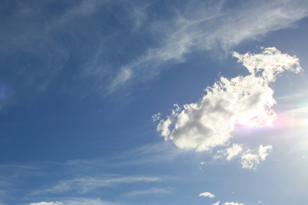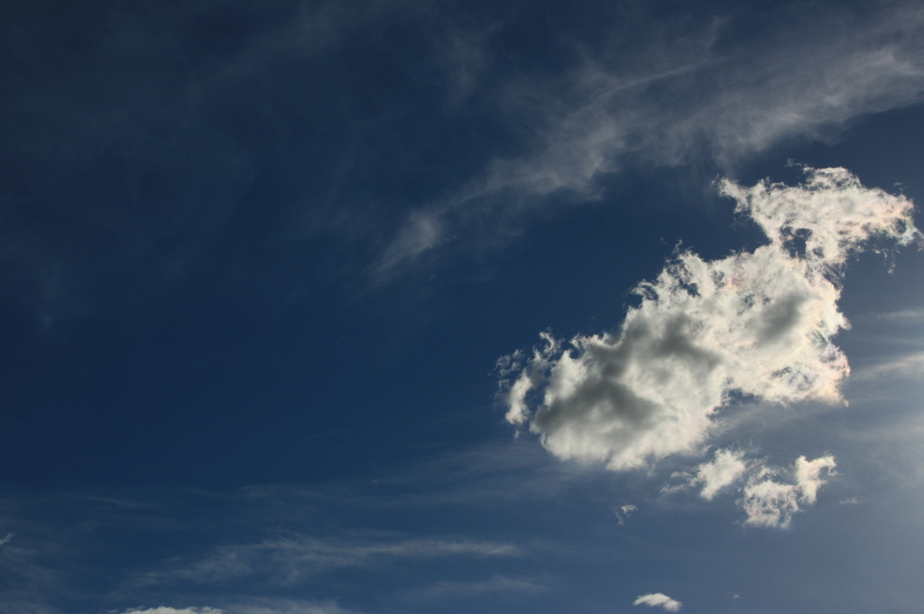 強い強い光のせいで、雲の端が虹色に光る。