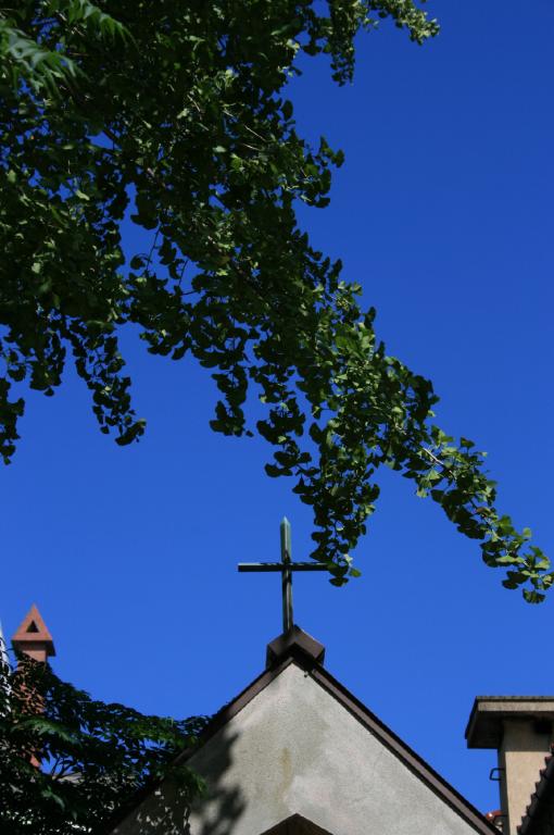幼稚園の園庭をはさんで、プロテスタント教会が建っている。